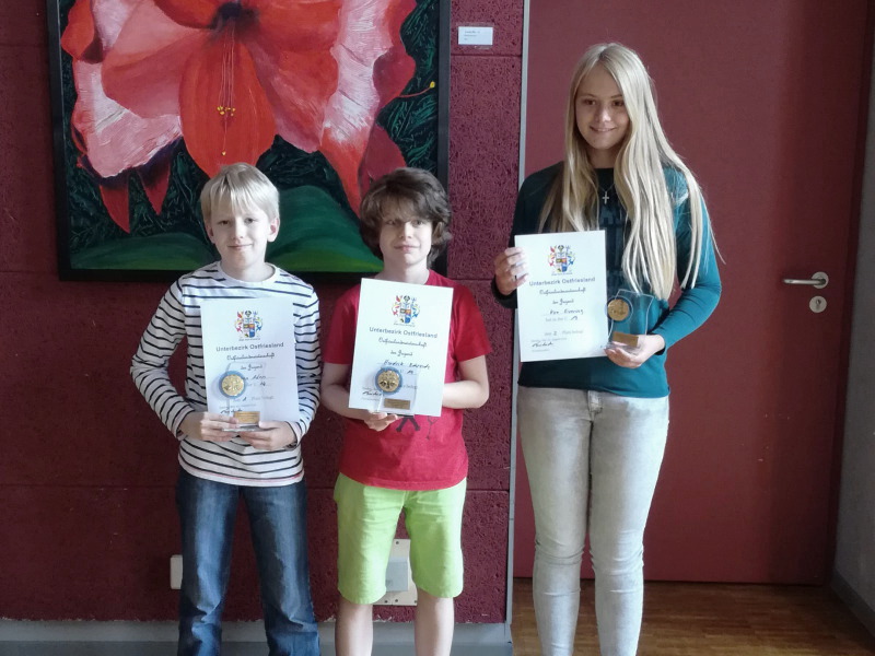 In Emden fanden am letzten Sonnabend (20.8.2016) die Jugendeinzelmeisterschaften des Schachbezirkes Ostfriesland statt. Dabei belegte Tammo Aden in der U14 den ersten Platz, Dritter wurde Hendrik Behrends. Steffen Petras wurde in der U16 Zweiter, Keno Aden Dritter.